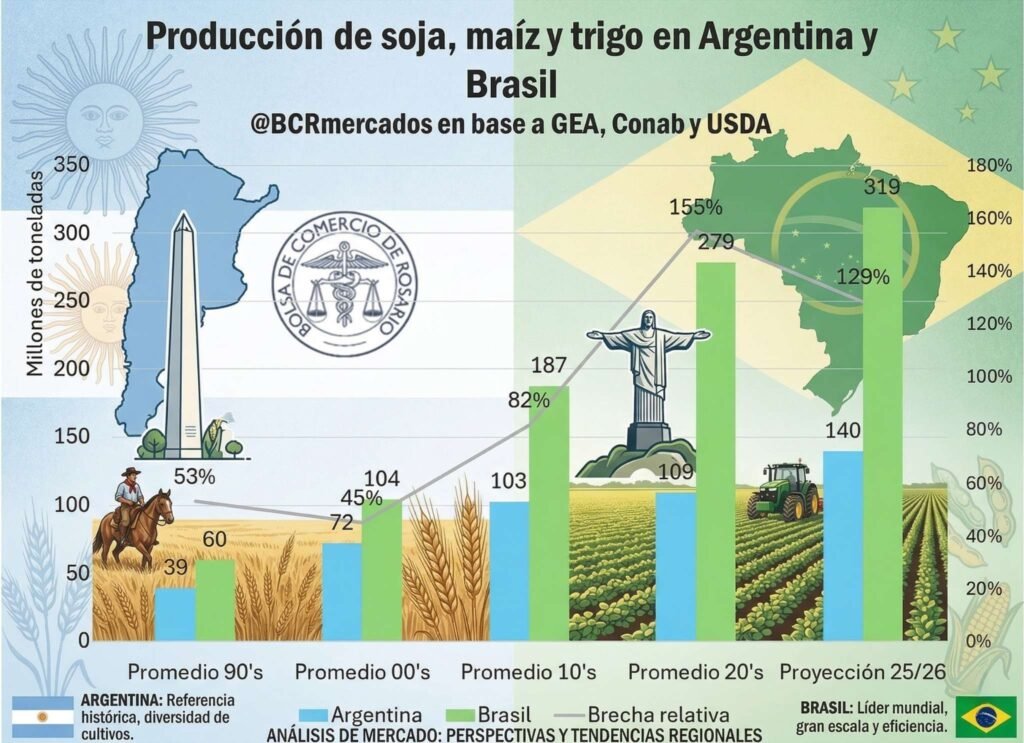 La proyección para el ciclo 2025/26 muestra un cambio de dirección. Brasil llegaría a 319 millones de toneladas, mientras que Argentina treparía a 140 millones. La brecha relativa cae al 129%: todavía amplia, pero en descenso por primera vez en décadas.