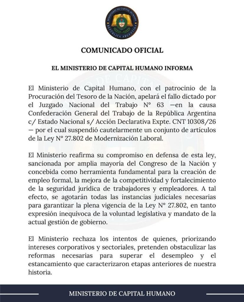 El Ministerio de Capital Humano anunció este lunes que apelará el fallo del Juzgado Nacional del Trabajo N° 63, que suspendió cautelarmente un conjunto de artículos de la Ley N° 27.802 de Modernización Laboral. La medida judicial fue impulsada por la Confederación General del Trabajo (CGT) a través de una acción declarativa contra el Estado Nacional.