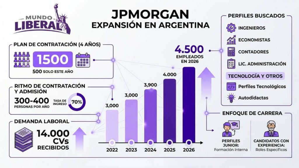 JPMorgan prioriza perfiles junior para desarrollarlos desde adentro, aunque también incorpora profesionales con experiencia para roles específicos. Entre las carreras más requeridas aparecen ingenieros, economistas, contadores y licenciados en Administración de Empresas, con una creciente demanda de perfiles tecnológicos y también espacio para candidatos autodidactas que demuestren capacidades concretas.